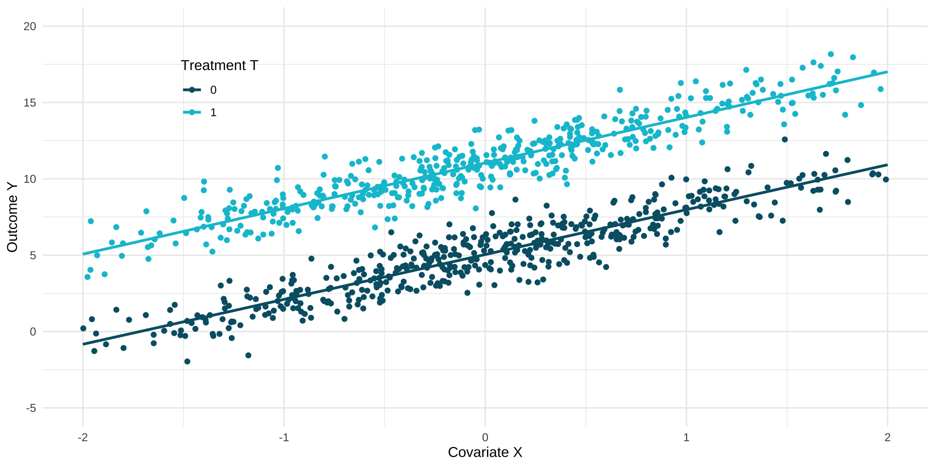 \(Y_i = \beta_0 + \beta_T T_i + \beta_{X_1} X_{i1} + \dots + \beta_{X_K} X_{iK} + \epsilon_i\)