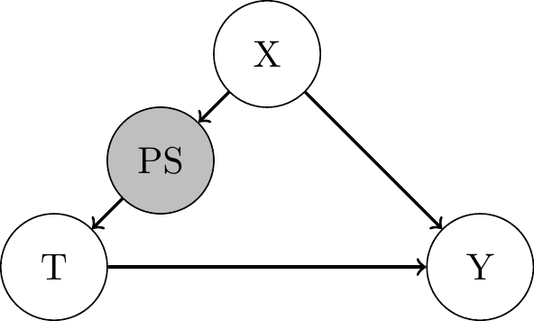 \[\tau_{\text{ATE}} = \mathbb{E}[Y_i(1) - Y_i(0)] = \mathbb{E}[\frac{T_iY_i}{PS(\mathbf{X_i})}] - \mathbb{E}[\frac{(1-T_i)Y_i}{1-PS(\mathbf{X_i})}]\]