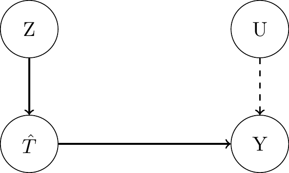 Stage: Linearly regress \(Y_i\) on \(\hat{T}_i\) to estimate \(\mathbb{E}[Y_i|\hat{T}_i]\). Obtain the estimate \(\hat{\tau}\) as the fitted coefficient of \(\hat{T}_i\).