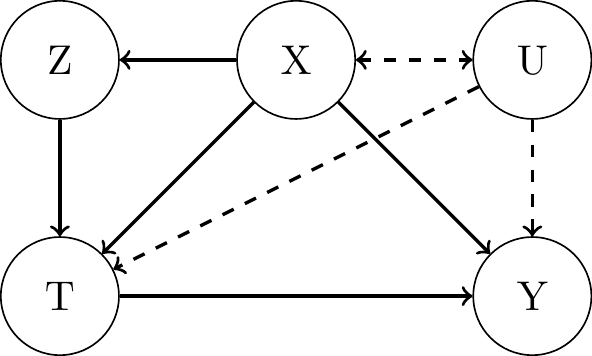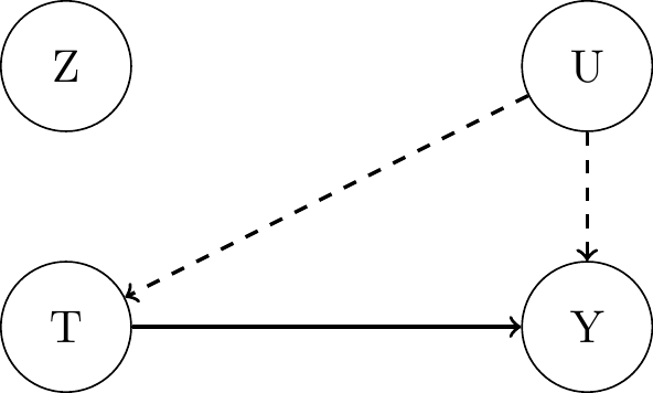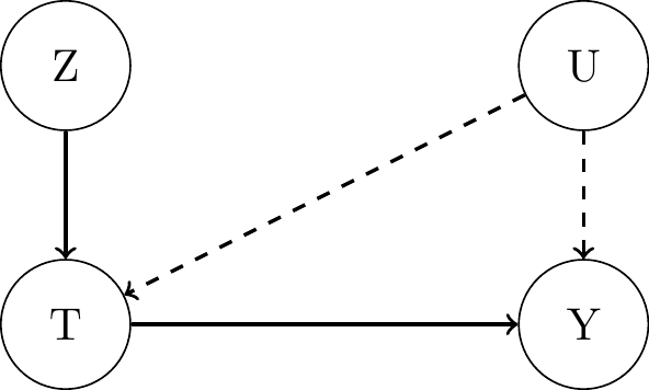 Wald Estimator:\[ \hat{\tau} = \frac{\sum_{i=1}^n Y_i \cdot Z_i - \bar{Y} \bar{Z}}{\sum_{i=1}^n T_i \cdot Z_i - \bar{T} \bar{Z}} \]