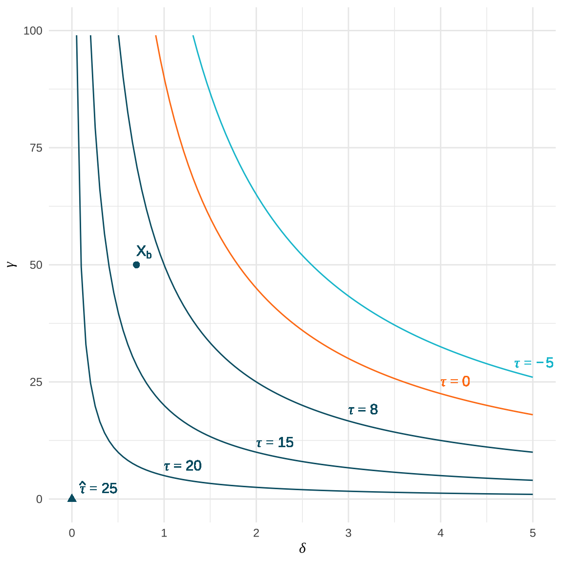 impact of the unobserved confounder \(U_i\) on the outcome \(Y_i\).imbalance in the unobserved confounder \(U_i\) across values of \(T_i\).impact on the outcome times its imbalance across treatment levels.Question: How strong does the bias of an unobserved confounder have to be to invalidate the treatment effect estimate?contour plot of the bias \(\gamma \delta\) as a function of \(\gamma\) and \(\delta\).Hypothetical example: estimated treatment effect unadjusted for the unobserved confounder \(\tilde{\tau} = 25\).