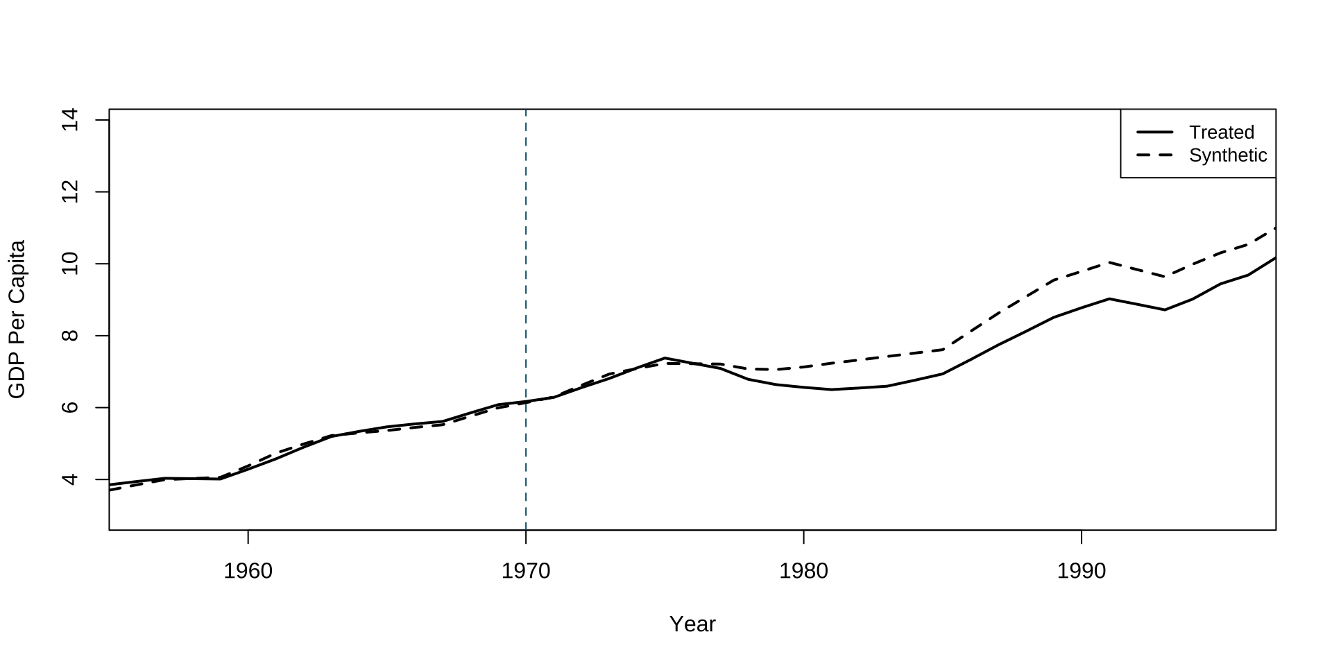 path.plot(dataprep.res = dataprep.out, synth.res = synth.out,Xlab="Year",Ylab="GDP Per Capita")