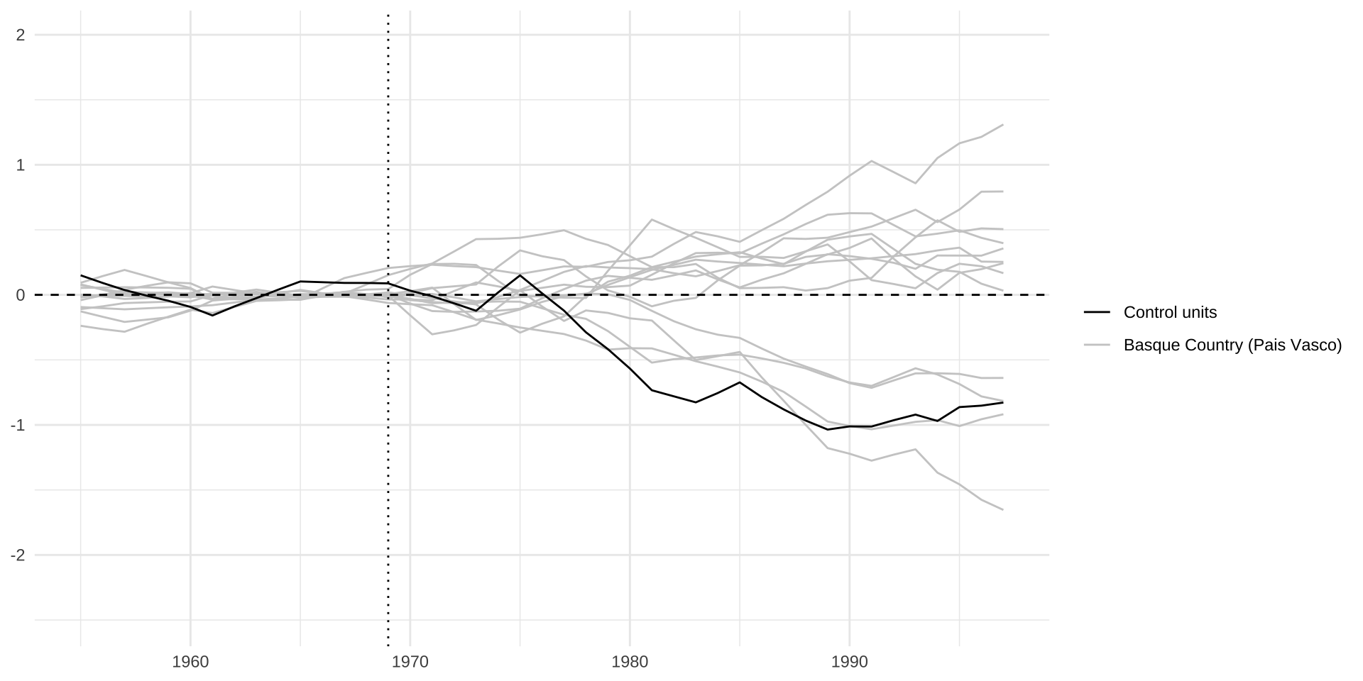placebo effects in each iteration.p-Value: proportion of placebo effects with a larger Post-MSPE/Pre-MSPE-ratio than the actual treatment effect.library(Synth)