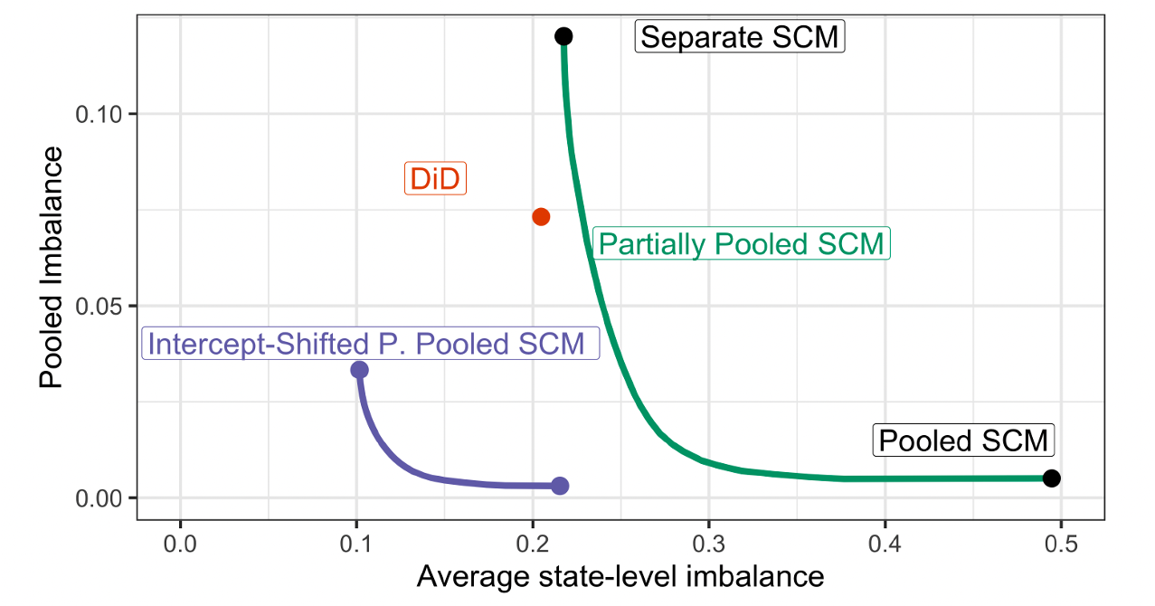 Partially-pooled Synthetic Control (Ben-Michael, Feller & Rothstein, 2021b): Minimize a weighted average of the two imbalances.